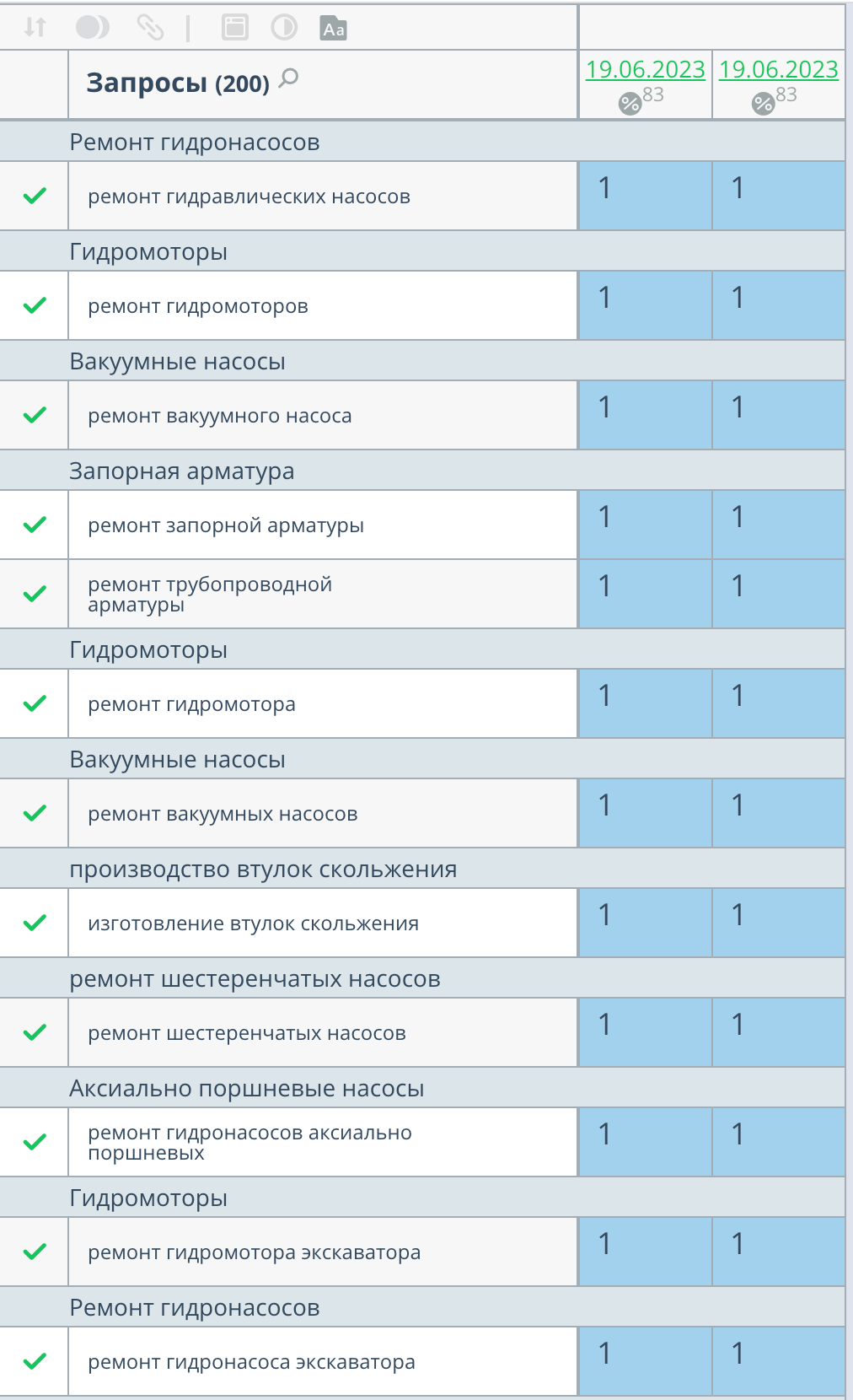 Собрано максимально широкое ядро поисковых запросов. Из ядра не были исключены информационные запросы, так как трафика в тематике мало, любой посетитель, даже по информационному запросу, ценен.