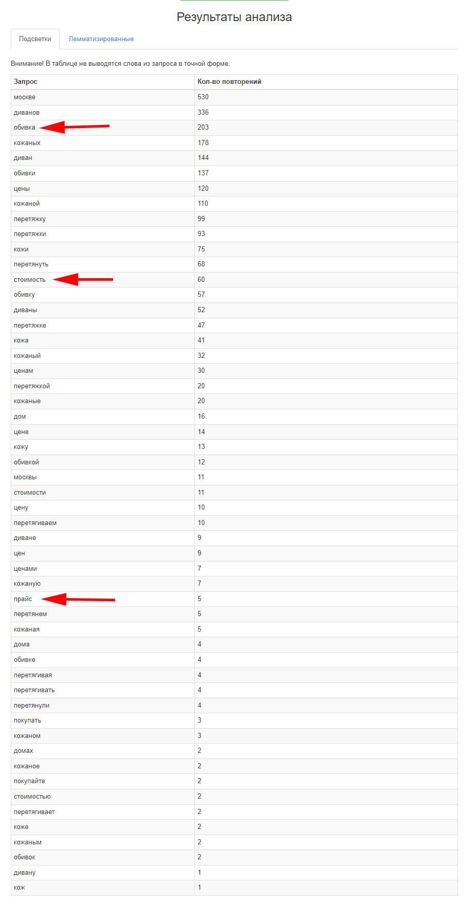 В результатах выделяем для себя слова которые не входят в наши запросы: обивка, стоимость, прайс, они понадобятся для следующего пункта — написания заголовка страницы.
