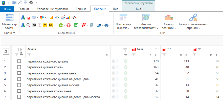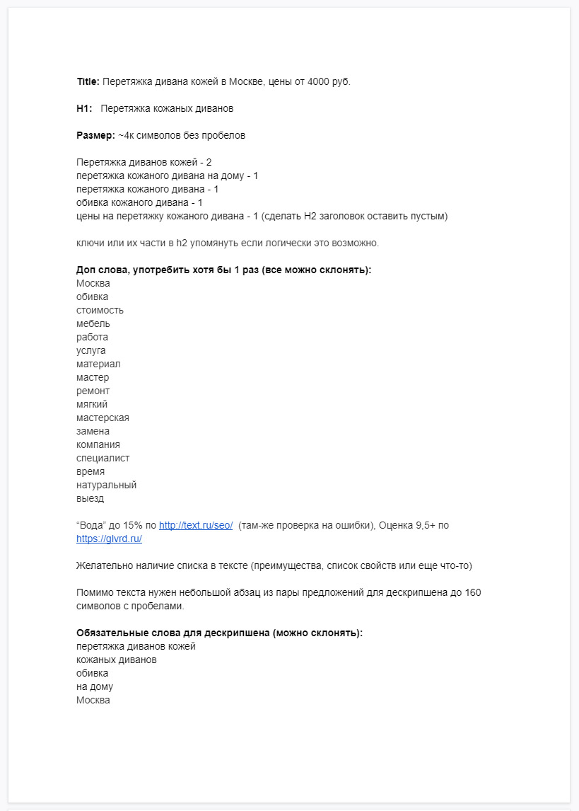 Первое, что нам понадобится – определиться с запросами для нашего текста. Например, у нас есть сайт мебельного ателье в Москве и планируется создание страницы перетяжки кожаных диванов. Мы собираем запросы и их синонимы, оцениваем частотность, конкурентность, коммерциализацию и прочие параметры (более подробно расскажем в следующей статье, как только она выйдет тут будет ссылка на неё).