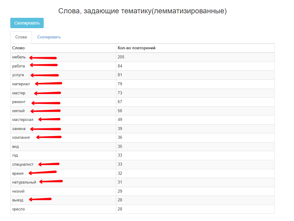 Про слова подсветки мы уже говорили выше, их отдаем копирайтеру чтобы использовал в тексте (не столь важно рядом с ключом или нет). LSI – это слова задающие тематику текста, т.е. например прочитав слова линза, штатив, объектив, вспышка мы поймем, что в тексте говорится и фотоаппарате, хотя само слово тут и не упоминается. Собираем слова мы все в том-же ARSENKIN TOOLS в уже открытой ранее нами вкладке с результатами в блоке «Слова, задающие тематику». Отдаем копирайтеру слова максимально подходящие нам по смыслу (часто в результатах попадаются слова не несущие особой смысловой нагрузки):